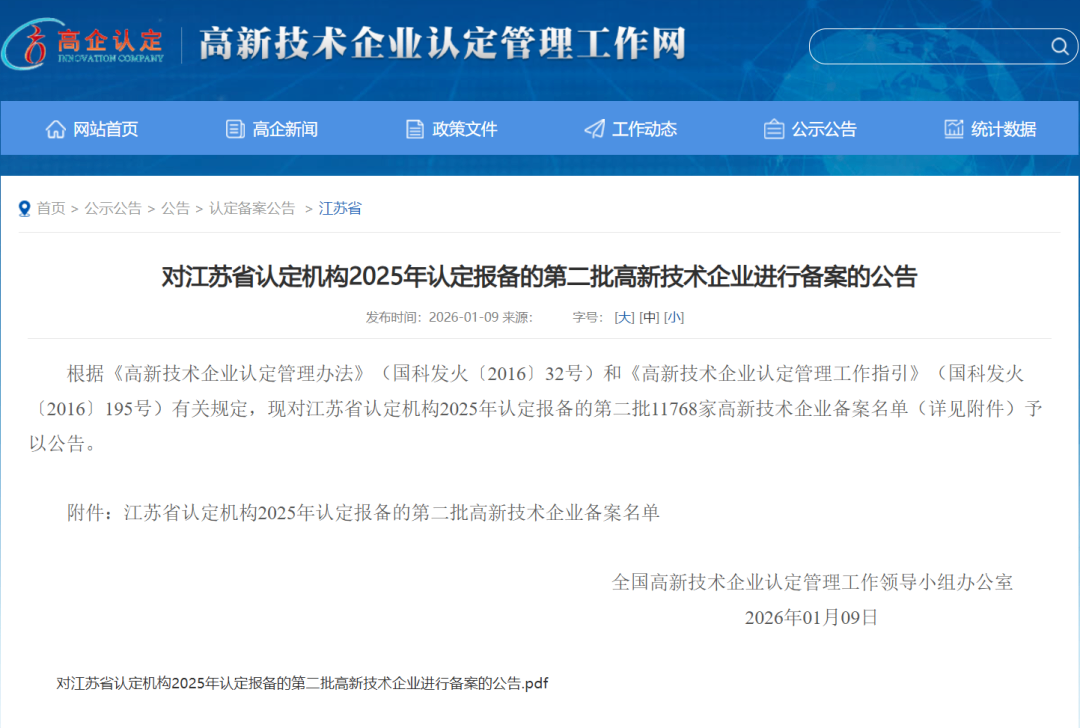 近日,根据《高新技术企业认定管理办法》及相关规定,全国高新技术企业认定管理工作领导小组办公室对江苏省认定机构2025年认定报备的第二批企业进行备案公示。华体会体育凭借其扎实的科技创新实力与完善的研发管理体系,成功荣列在本次备案中。